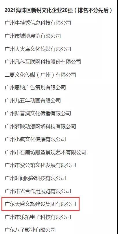 广东天盛文旅建设集团积极发挥行业优势,促进文旅深度发展,锐意进取荣获“2021海珠区新锐文化企业20强”企业。