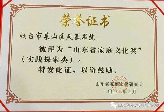 “山东省家庭文化奖”,是山东省家庭文化研究会独家评选表彰的重要奖项,主要是对在家庭文化建设中做出突出成绩的单位和个人进行表彰奖励,具体分为理论研究、实践创新、家谱、文化艺术、先进人物等类别。此次对王天仁与家人创立的烟台天泰书院的表彰,主要是鼓励其创立“家庭文化主题书院”,探索创新家庭文化发展的新模式。