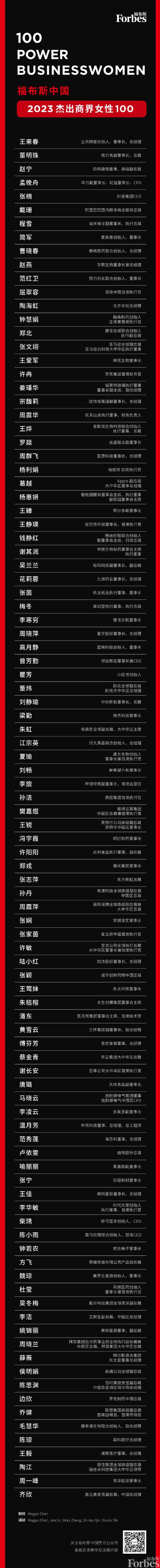 这是福布斯中国第九次发布“福布斯中国杰出商界女性100”。榜单以国内上市公司女性高管、入选福布斯全球企业2000强的跨国公司在华女性领导人,以及独角兽企业女性创业者为研究对象,通过对候选人所领导业务经营业绩、资本市场表现、市场规模、行业影响力和创新力等数据分析,从上千位候选人中遴选出最终的100人。