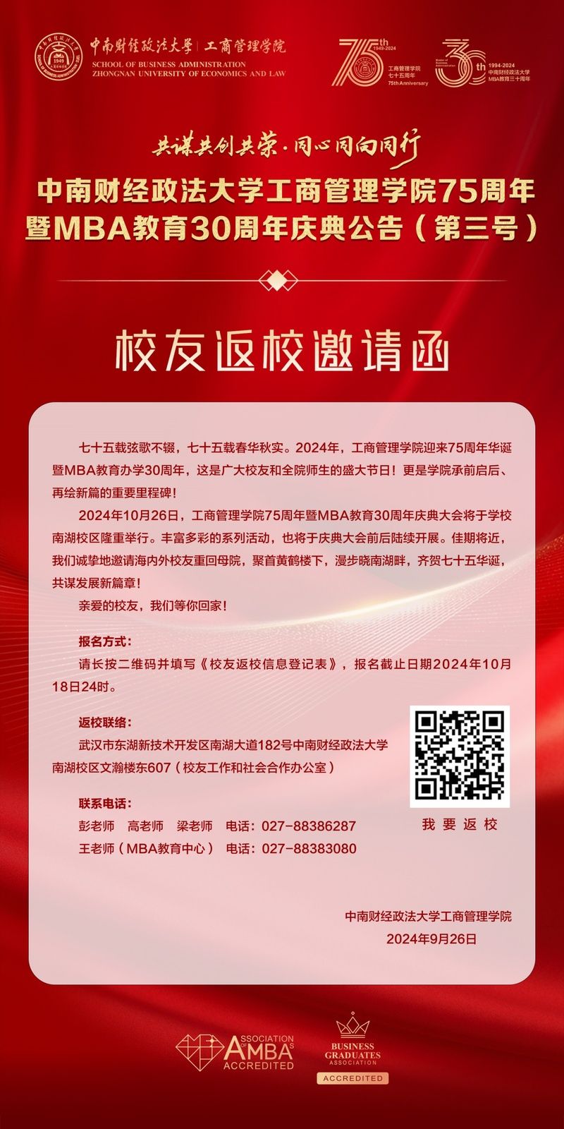共谋共创共荣 · 同心同向同行——bwin必赢75周年暨MBA教育30周年庆典公告(第三号)——校友返校邀请函