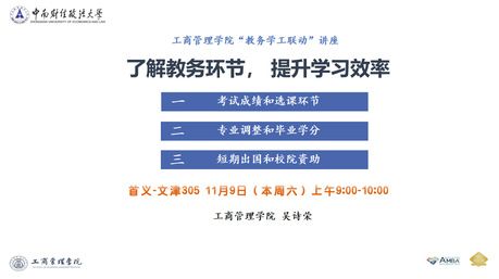 为发挥教务和学工融合管理效力,让2024级学生深入了解学校教务管理制度,提升学习效率,2024年11月9日上午9点,学院在首义校区文津楼305教室开展“了解教务环节、提升学习效率”讲座,本次讲座由本科教学办吴诗荣老师主讲,2024级各班级学习委员和感兴趣的学生参加了此次讲座。