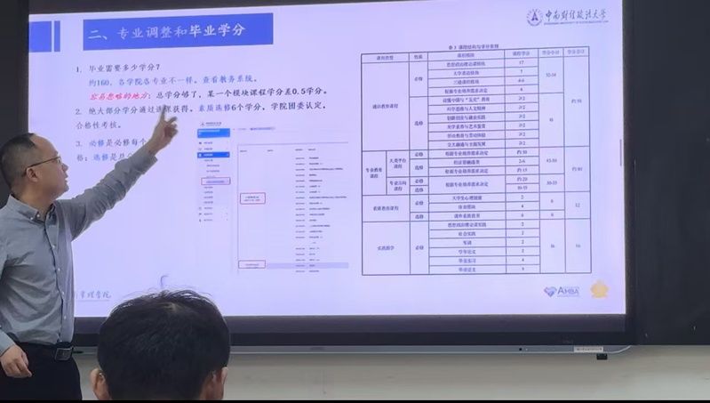 在“专业调整和毕业学分”中,吴老师介绍了学校调整修读专业的最新政策,认为要提前了解申请转入专业的条件并正确看待所学专业,熟悉本专业培养方案,完成各个课程类别学分和毕业总学分。