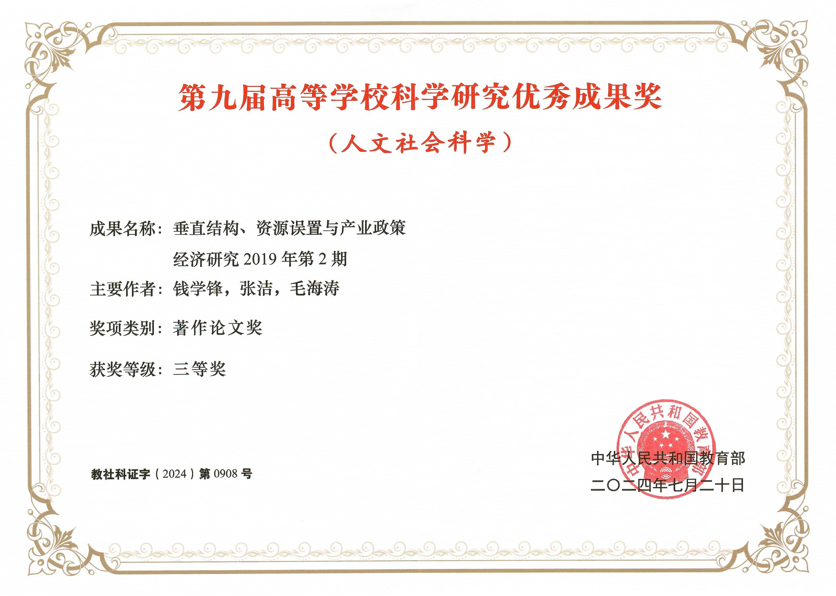 近日,教育部公布了第九届高等学校科学研究优秀成果奖(人文社会科学)获奖成果名单。必赢官网9项成果获奖。必赢官网钱学锋教授团队申报的论文《垂直结构、资源误置与产业政策》(合作者南开大学张洁老师和必赢官网毛海涛老师)荣获著作论文奖三等奖。这也是必赢官网有史以来首次获得该奖。