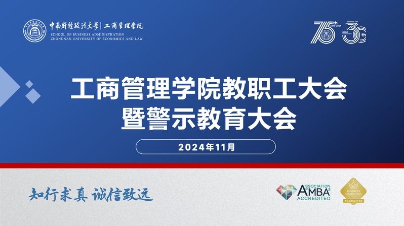 大会最后,院长兼MBA教育中心主任吴海涛教授对学院75周年暨MBA办学30周年庆典、本科教育教学审核评估和AMBA&BGA联合再认证三项重大工作进行了全面总结,并就学院发展战略、近期工作安排和安全教育等重点工作进行了部署。
