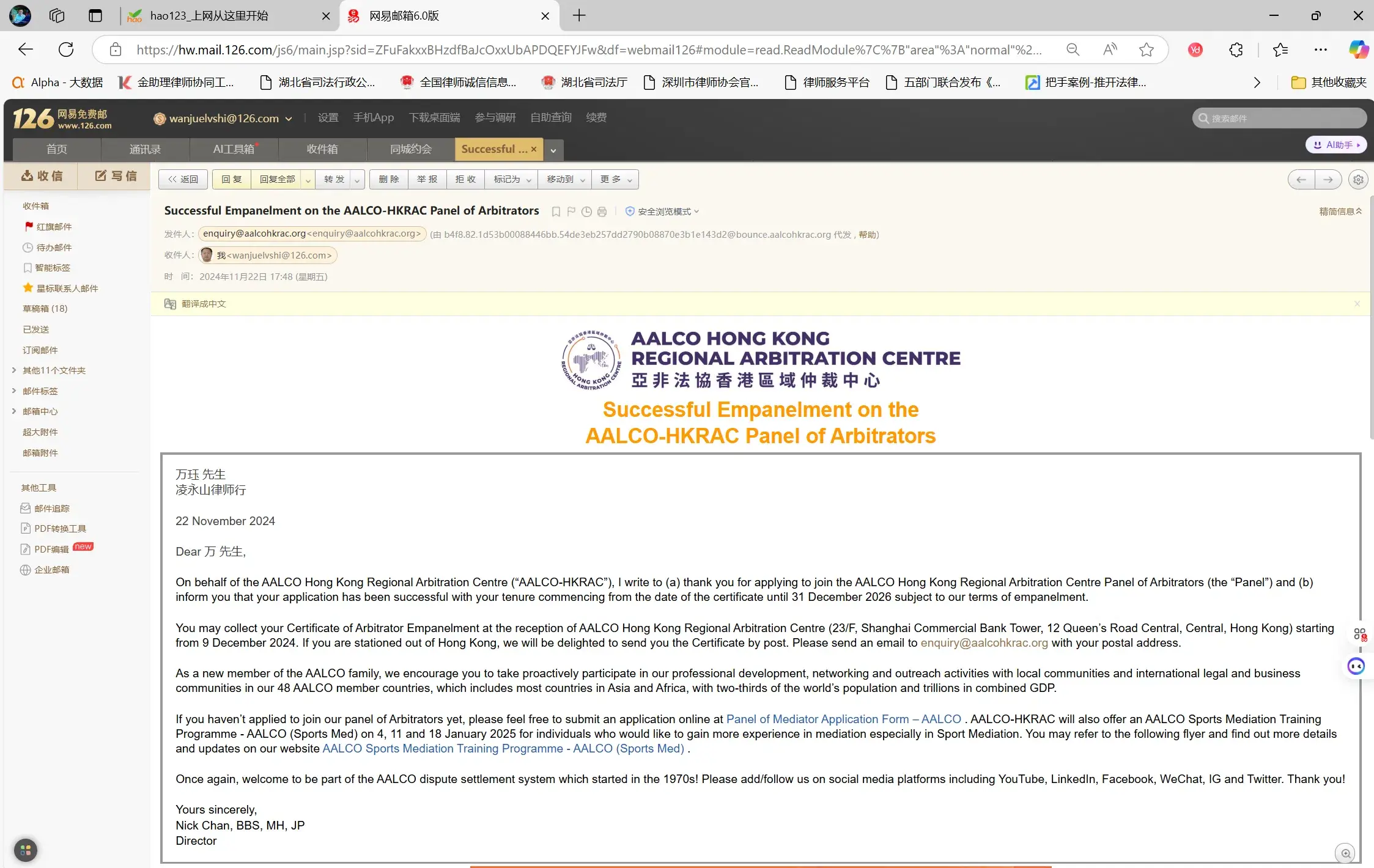 11月22日,必赢官网2007级MBA校友万珏律师接到亚非法律协商组织(英文简称AALCO,中文简称亚非法协)香港区域仲裁中心通知,其成功加入亚非法协香港区域仲裁中心仲裁员名册(“名册”),任期从证书颁发之日起开始,直至2026年12月31日。